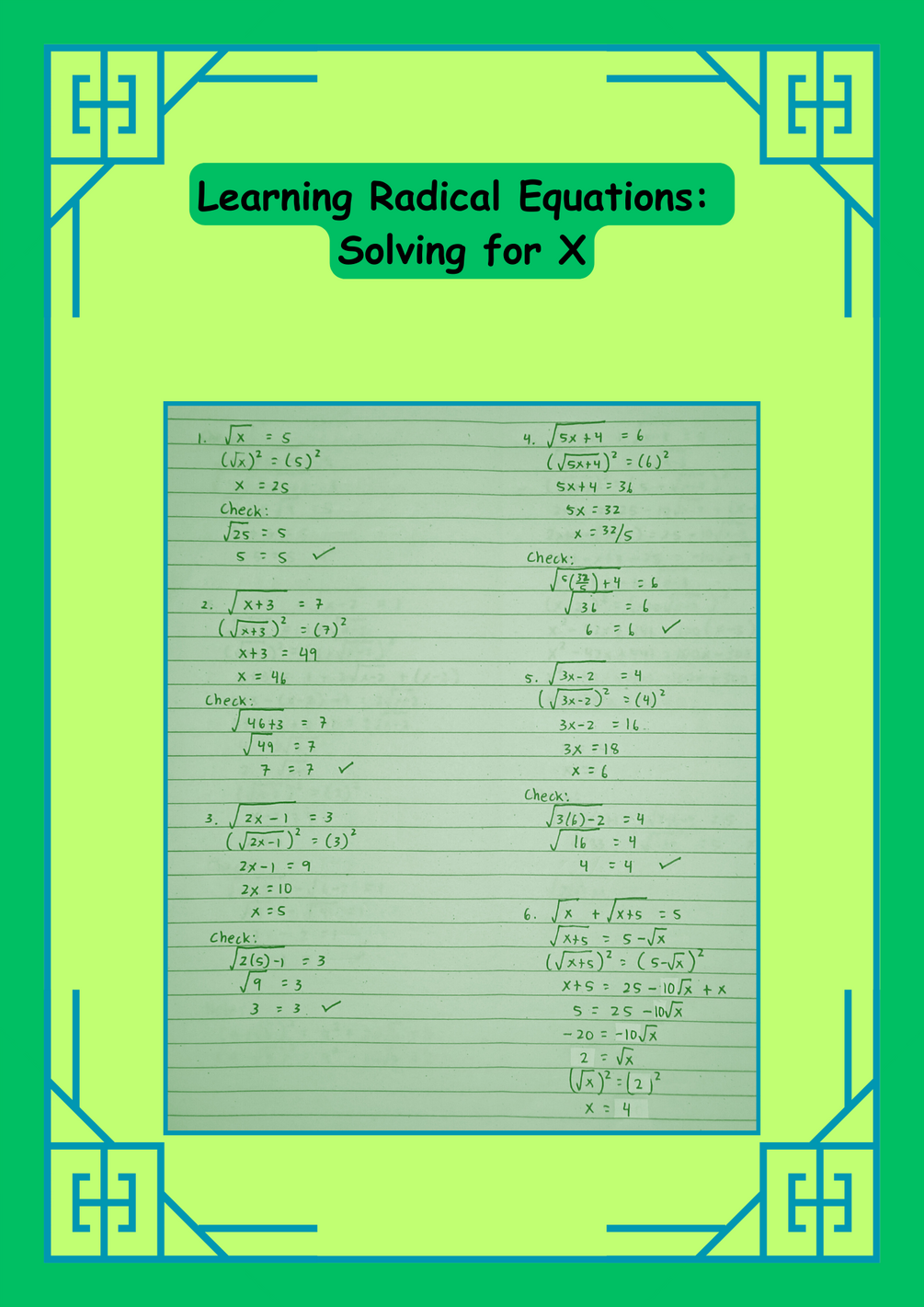 Study and learn radical equations and confidently solve for "x" with this handwritten e-book! Perfect for students, teachers, and self-learners, this guide breaks down the step-by-step process of solving radical equations in a clear and engaging way.